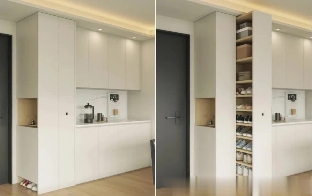 进门后一览无余,难以满足鞋柜的设置需求。于是,利用餐边柜侧面来实现收纳功能,同时为了拓展收纳量,还增加了一组抽拉鞋柜,双倍收纳能力轻松满足刚需。《为何聪明人都爱抽拉鞋柜?最大化收纳空间》一文或许能给你更多启发。