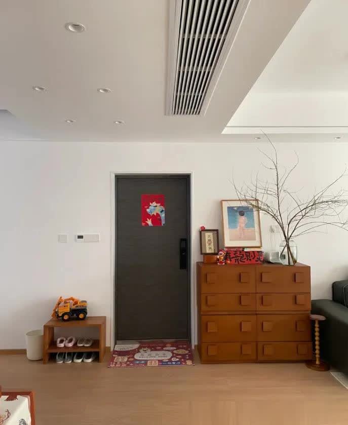 这是一字型无玄关的客厅,曾考虑过做通顶鞋柜,但担心会显得压抑;刚好家中是中古风装修风格,便采用卡门柜来实现一个鞋柜的功能,另一边搭配同色换鞋凳,两层放鞋,刚好能满足刚需,而且空间也不会显得压抑。